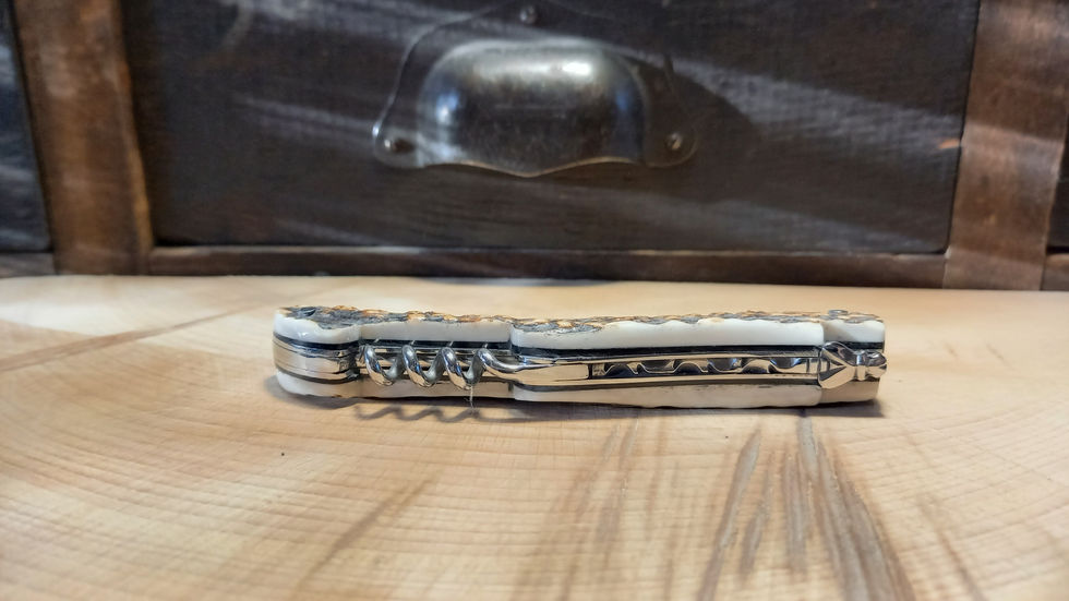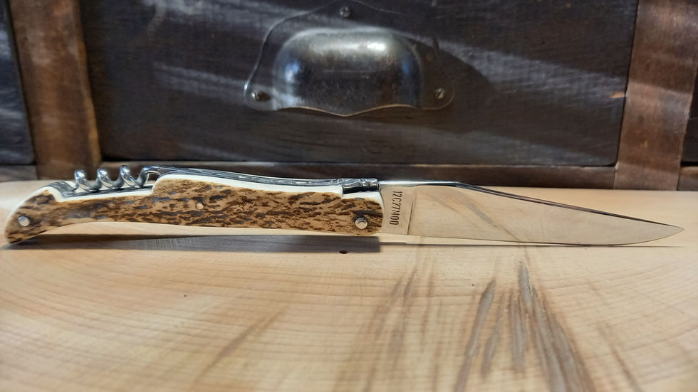 Magnifique couteau Laguiole fermant équipé d’une lame 12c27 finition brillante et d'un tire bouchon avec un manche en bois de cerf posé sur un placage en ébène, le ressort et l'abeille sont sculpté à la main.Les platines sont en inox.